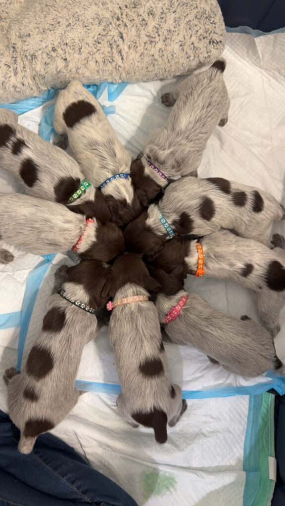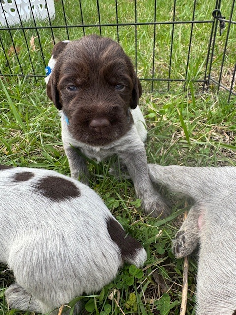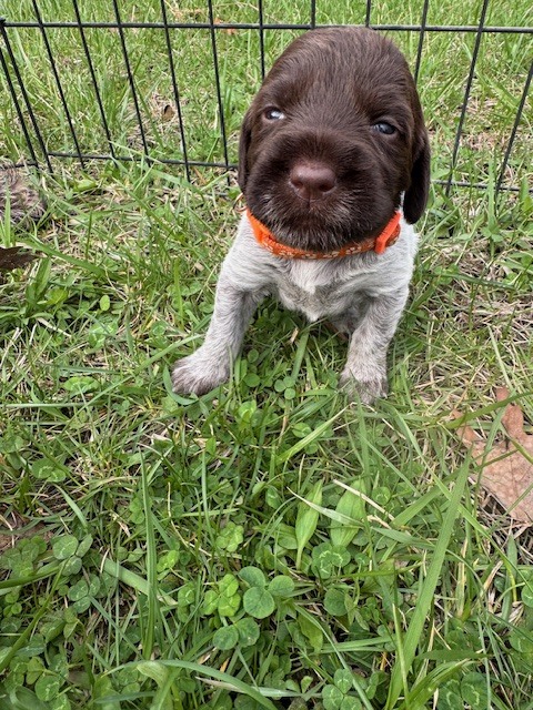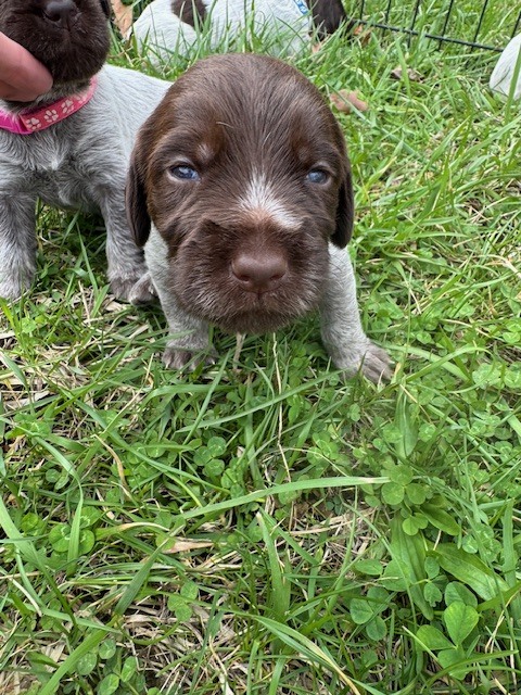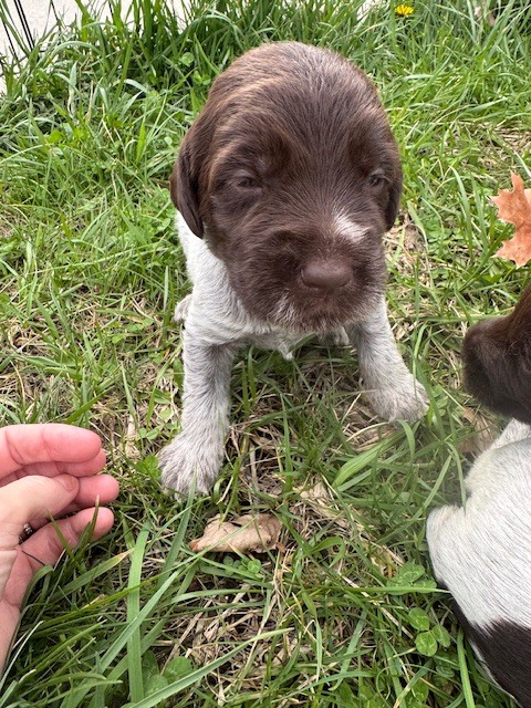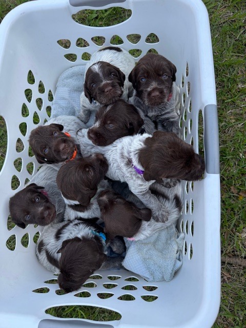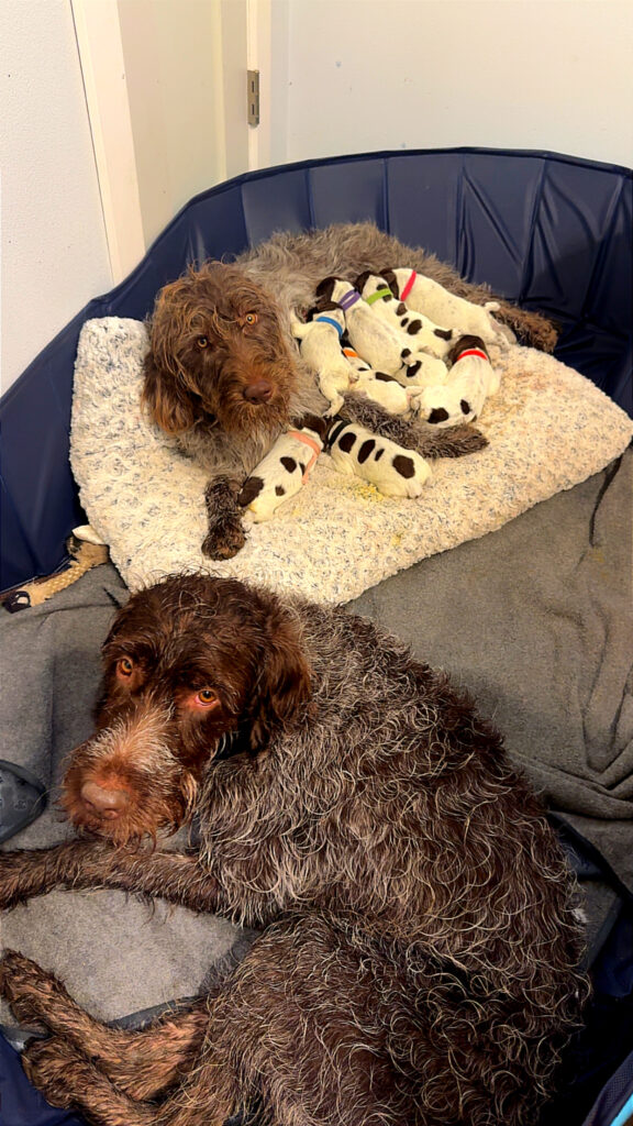 Pups born 3/26/26. Taking deposits- 4 male, 5 female. Located in Central Iowa. AKC registered. Up to date on vaccinations, microchipped. Exceptional hunting and award winning blood lines. Pups exposed to gunshots, pheasant and duck scents, intro to water in our private pond, unlimited outside access, exposed to other dogs, cats, & children. Parents are both excellent family dogs and active hunters. Both parents have longer, bushy, wiry coats. Will make terrific addition to your family & hunting experience. Both parents are our family pets and hunted with- as you can see pups are exposed to both Mom & Dad within our home.